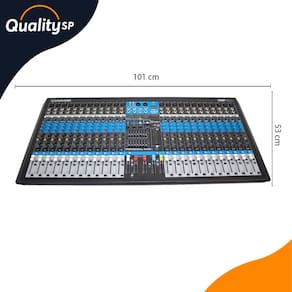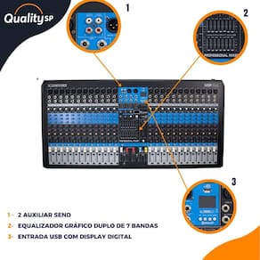 Especificações Técnicas: • 24 canais mono XLR e de linha P-10 • Equalização de 3 vias (grave, médio e agudo) por canal • Possui Efeitos 24 bits • 99 efeitos • Processador de efeitos com tela de LCD • Equalizador gráfico duplo de 7 bandas • 2 auxiliar send • Entrada USB com display digital • Gravação e reprodução direta em USB • Interface de áudio • Função Bluetooth • Leds indicadores de pico • Bivolt