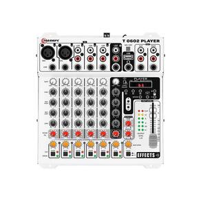 Além de controlar e mixar o seu sistema de som, a t-0602 player é capaz de reproduzir sua playlist favorita sem a necessidade de usar um player convencional. O player integrado, possui conexão bt para conectar seu smartphone, tablet entre outros dispositivos. Também possui entrada usb, recepção de fm e saída para fones de ouvido. E para ficar ainda melhor, conta com o recurso echo fx, que possibilita adicionar o efeito eco em suas músicas ou voz. E para finalizar incluímos o controle remoto de longa distância, que permite aumentar ou diminuir o volume, trocar faixas e pastas, entre outras funções, quando utilizada a função player.