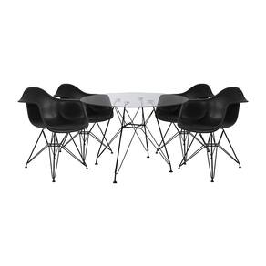 Mesa De Vidro Redonda Eames Eiffel 90cm Com 4 Poltronas Pretas Ferro PretoO Conjunto de Mesa Eames Eiffel e Poltrona Daw se destaca pelo design moderno e sofisticado. Com base em ferro que confere total resistência, garantindo melhor durabilidade, sendo uma ótima escolha para quem busca conforto e design único.Tipo: ConjuntoModelo: DawCor do Tampo: VidroCor do Assento: PretoCARACTERÍSTICASAssento: PolipropilenoTampo: PretoBase: FerroGarantia: 90 DiasDIMENSÕES DA POLTRONAAltura: 80cmAssento até o chão: 40cmBraço do assento até o chão: 65cmLargura: 38cmComprimento: 38cmSuporta até: 120kgDIMENSÕES DA MESAAltura: 76cmDiâmetro: 90cmRECOMENDAÇÕESLimpeza: Utilize um pano macio levemente úmido.Necessita montagem.ATENÇÃOAS IMAGENS SÃO MERAMENTE ILUSTRATIVAS E PODEM SOFRER VARIAÇÕES DE COR E PEQUENOS DETALHES DE ACORDO COM O SEU MONITOR, ILUMINAÇÃO DO AMBIENTE E ATÉ MESMO A SUA PERCEPÇÃO VISUAL.