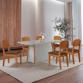 A cadeira Copper, com encosto em MDF e Assento Estofado, oferece Conforto e suporte ideais. O conjunto e uma escolha que agrega sofisticacao e praticidade a qualquer ambiente.
