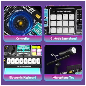 A mesa DJ mixer musical infantil Tsomtto é um brinquedo eletrônico que combina teclado de piano, discos de DJ, efeitos sonoros e painel com luzes LED dinâmicas para atividades musicais e de ritmo. O brinquedo incorpora 12 músicas pré-programadas em estilo MIDI, funções de efeitos de DJ, teclas de piano, mesa giratória, jogo tipo “acertar o alvo” e entrada para microfone, criando um centro de atividades musicais para crianças. O painel permite ajustes de luz, reprodução de sons, gravação simples e conexão a dispositivos externos via USB para ampliar as possibilidades de uso.