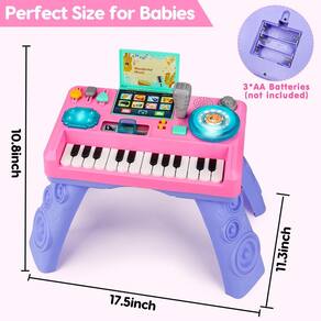 - Mesa DJ multifuncional para bebês com toca-discos iluminado, 24 teclas de piano, 8 sons de instrumentos e 3 efeitos sonoros de celular.