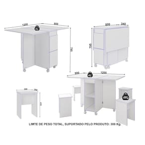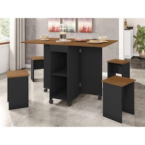 O conjunto Mesa Dobrável Paris é composto por uma mesa retangular com quatro bancos, ideal para você que conta com pouco espaço em sua casa ou apartamento! Por ser dobrável é compacto e possui compartimentos para guardar os quatro bancos embutidos na mesa. Adaptável é a melhor opção para ambientes pequenos que necessitam um conjunto de jantar. Acabamento da Cadeira/Banco: Pintura UV Acabamento da Mesa: Pintura UV Ambiente Principal: Cozinha Cadeira/Banco estofada: Não Cadeira/Banco suporta até: 95 kg Complexidade da Montagem: Média: pode ser montado por mais de uma pessoa e/ou necessite de maior conhecimento para montagem Cor: Marrom/Preto Cor do Produto: Marrom/Preto Escala de Brilho: Fosco Espessura do Tampo: 15 mm Estrutura do Assento: MDP - 1,5cm Itens Inclusos: 1 Mesa Dobrável, 4 bancos, kit ferragens e manual de montagem Manual de Montagem e Instalação: https://cdn2.madeiramadeira.com.br/atributo/zanzini/1256903-10390000-mesa-dobravel-paris.pdf Material da Base da Mesa: MDP Material da Estrutura da Cadeira: MDP Medida da Cadeira/Banco (A x L x P): 41x30x26,8 Medida da Mesa (A x L x P): 79,5x120x80 Medida do Tampo (L x C x E): 80x120 Mesa suporta até: 8 kg Necessita Montagem: Sim Origem do Produto: Nacional Peso da Cadeira/Banco: 3,2 kg Peso da Mesa: 29,7 kg Possui Apoio para Braços: Não Possui Apoio Para os Pés: Não Recomendações de Uso, Manutenção e Limpeza: Limpar com flanela ou pano macio seco, não utilizar produtos abrasivos, desengordurantes, álcool ou qualquer outro produto químico. Não expor o produto diretamente à luz solar e à umidade Sistema de Montagem: Parafusos auto atarraxantes, cola e cavilhas