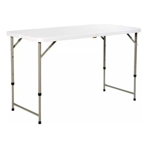 Construção Durável: Feita de plástico resistente, esta mesa é leve para transportar, mas robusta o suficiente para suportar o uso em ambientes externos.