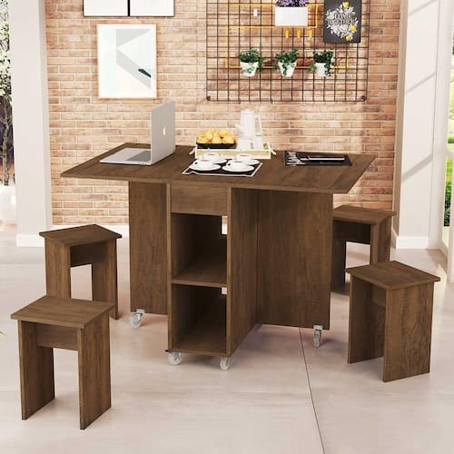 - Ao abrir o tampo e retirar os bancos, se transforma em uma mesa