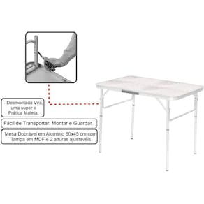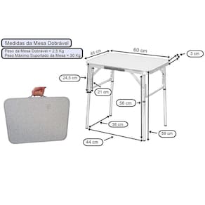- Dimensoes tampo: 60 x 45cm - Altura com pernas menores: 26cm - Altura com pernas maiores: 59cm - Peso: 2,1KG - Material: Estrutura em aluminio/Tampo em MDF