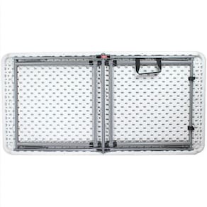 A mesa é fabricada em polietileno de alta densidade, garantindo resistência e durabilidade superiores. A presença de uma trava de segurança garante a estabilidade do tampo, enquanto os pés contam com um acabamento emborrachado anti-deslize, proporcionando estabilidade mesmo em terrenos irregulares.
