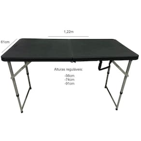 Mesa Dobrável Vira Maleta Com 3 Regulagens De Altura PretaComprimento 1,22mAlturas reguláveis: 56cm / 74cm / 91cmLargura 61cmPeso Bruto 9,5kgPeso Liq 8,5kgEmbalagem fechada 61,5x8,5x62cmCom trava nos pésMontagem simples, basta abrir o tampo e abrir os pésCor do tampo PretaCor da ferragem CinzaTampo de Polipropileno de alta densidadePés e Suportes internos em ferro com pintura especial Marca: Vghome