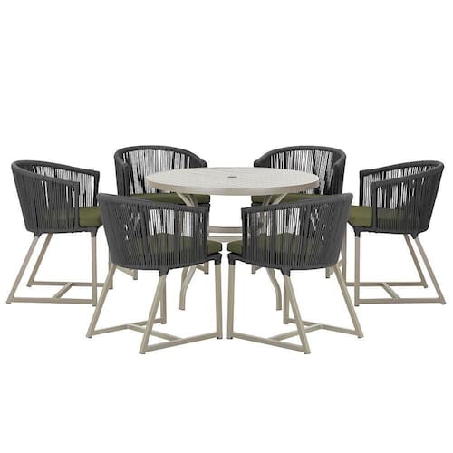 Combinando estilo e resistencia, esta Mesa e cadeiras traz o melhor do design contemporaneo em aluminio com micro pintura e acabamento em corda nautica. O Estofado impermeavel completa o conforto e a funcionalidade, tornando-a ideal para ambientes externos e internos.