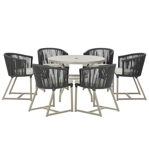Combinando estilo e resistencia, esta Mesa e cadeiras traz o melhor do design contemporaneo em aluminio com micro pintura e acabamento em corda nautica. O Estofado impermeavel completa o conforto e a funcionalidade, tornando-a ideal para ambientes externos e internos.