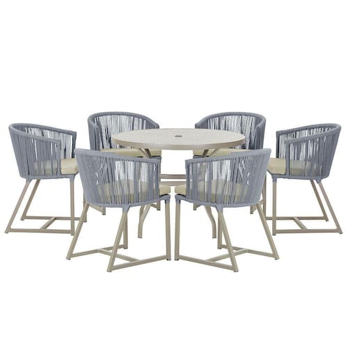 Combinando estilo e resistencia, esta Mesa e cadeiras traz o melhor do design contemporaneo em aluminio com micro pintura e acabamento em corda nautica. O Estofado impermeavel completa o conforto e a funcionalidade, tornando-a ideal para ambientes externos e internos.