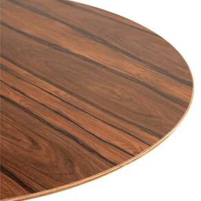 Trazendo elegância e beleza ao seu ambiente, nossa mesa é confeccionada com materiais de qualidade, tendo seu tampo em MDF revestido com laminado melamínico pau ferro. Na parte inferior do tampo, o acabamento utilizado é o mesmo das mesas Tulip Saarinen, com chanfro em 30 e acabamento envernizado e sua base é em madeira.