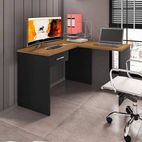 Conta ainda com 1 gaveta, com corrediças metálicas. Seu destaque fica para versatilidade de na hora de montar, podendo escolher o lado em que a extensão da mesa irá ficar montado, se é na esquerda ou direita