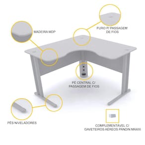 - Estação de trabalho no formato de mesa em L confeccionada em madeira (MDP).