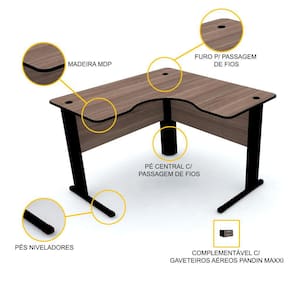 Uma estação de trabalho espaçosa para que você ou sua equipe se sintam confortáveis, produtivos e com toda a segurança e privacidade para trabalhar com vontade. Nesta mesa em L cor walnut e preto, você encontra praticidade, funcionalidade e a peça que faltava para mobiliar seu escritório. Com resistência e durabilidade garantidas graças a uma estrutura bem pensada e à qualidade da Pandin, organizar uma planta de estações de trabalho prática e esteticamente agradável com esta mesa em L fica fácil, fácil. Além de funcionar como mesa de trabalho, ela permite a realização de atendimentos ao cliente ou rápidas entrevistas ou reuniões, graças ao seu formato, que ainda conta com detalhes como passa-fios e pés niveladores. Invista neste móvel e facilite o dia a dia da sua equipe, empresa, escola, consultório, hospital, instituição, clínica, companhia de telemarketing, departamento de atendimento ou até mesmo seu home-office. Surpreenda-se com esta mesa da linha Maxxi da Pandin e conheça em nossa loja mais opções desta linha completa que pode mobiliar seu escritório com qualidade, beleza e economia.