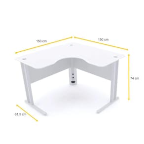 - Dimensões: 74 cm de altura x 150 cm de largura (mesa 1) x 150 cm de largura (mesa 2) x 61,5 cm de profundidade.