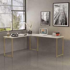 Mesa Em L Sem Prateleira Office Em Mdf Industrial Klm Store Dourado/off White A Mesa em L sem Prateleira Office em Mdf KLM Store e perfeita para quem busca praticidade e estilo. Com uma montagem rapida de apenas 20 minutos, voce tera uma mesa de alta qualidade em aco carbono e MDF, com uma capacidade de peso de ate 20 kg. Seu design em forma de L proporciona um espaco amplo e confortavel para suas atividades diarias. Alem disso garante um ambiente de trabalho ergonomico e funcional. Ideal para quem busca um movel duravel e com um toque industrial na decoracao. Caracteristicas: Marca: KLM Store Material da Estrutura: MDF/Aco carbono Suporta ate: 20 kg ATENCAO: Os acompanhamentos de decoracao e itens de eletronicos sao meramente ilustrativos.
