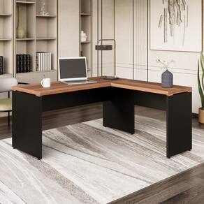 - Tampos em 40mm (engrossados). - Pés em 25mm (maciços). - Fabricada em MDP com revestimento em BP. - Você poderá escolher o lado que vai montar a mesa para formar o L. Mesa sem gavetas. - Sapatas com regulagem de altura. - Suporte decorativo entre o Tampo e o Pé.