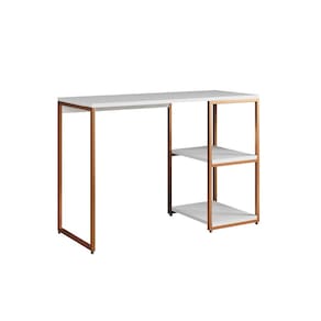 Transforme seu espaço com a escrivaninha com prateleira, um móvel que une praticidade e estilo. Projetada para otimizar ambientes, ela oferece uma superfície ampla para trabalho ou estudo, além de prateleiras integradas que facilitam a organização de livros, documentos e objetos pessoais. Ideal para quem valoriza um ambiente organizado e esteticamente agradável, a escrivaninha com prateleira é mais do que um móvel ? é uma aliada na produtividade diária. Tipo: Mesa Escrivaninha Modelo: Berlim Cor da ferragem: Cobre Cor do tampo: Branco