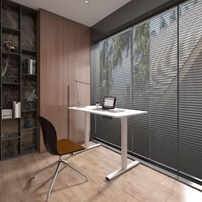 - Ajuste elétrico de altura para alternar entre posições sentado e em pé, variando de 750mm a 1100 mm. A funcionalidade da motorização eletrônica permite alternar entre essas posições, promovendo uma experiência de uso saudável e personalizada.
