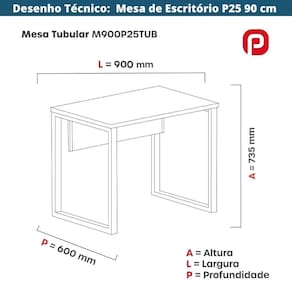 Mesa Escritório P25 TUB Pandin 90 cm (larg), uma peça que combina design moderno e praticidade. Com dimensões de 735mm (A) x 900mm (L) x 600mm (P), esta mesa é perfeita para escritórios e home offices, proporcionando um espaço ideal para sua produtividade.