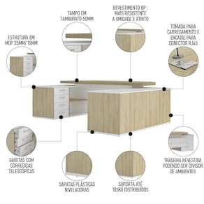 Otimize sua produtividade com o conjunto de escritório com Mesa Escritório Presidente e Balcão 2 Portas 3 Gavetas Corp A06 Carvalho/Branco, da Mpozenato.