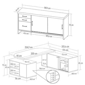 Esse conjunto exala charme contemporâneo e design imponente. A mesa para escritório rouba a cena com seu formato em U, além do amplo espaço interno com portas e gavetas, proporcionando armazenamento e estabilidade para todos os seus itens essenciais de trabalho. Já o balcão para escritório com 2 portas e 3 gavetas permite que você organize com praticidade pastas, documentos e suprimentos de trabalho.