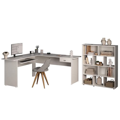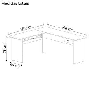 Compacto, completo, o melhor para seu home officie! Composto por 02 peças: Mesa Escrivaninha em L e Estante Livreiro, ambos com estrutura em MDF/MDP de 15 mm e acabamento em pintura UV texturizada (fosco). A mesa oferece praticidade com tampo em formato L, 1 gaveta com corrediças metálicas, puxador em plástico ABS e prateleira retrátil para teclado, também com corrediças metálicas. Os pés contam com sapatas esféricas em plástico ABS e o móvel suporta até 8kg (4 kg por tampo). Já a estante conta com 10 nichos bem distribuídos, sendo 4 com fundo fechado e 6 abertos, com capacidade de até 3 kg por nicho. Também possui 8 sapatas plásticas em ABS. Este conjunto chegará em sua casa separado em 02 volumes.