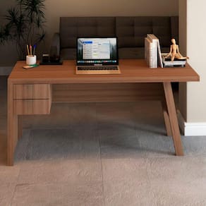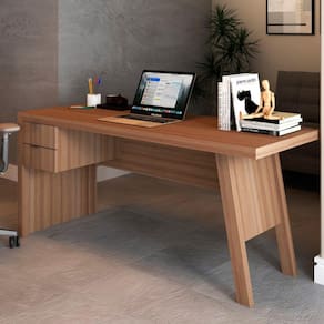 O(a) Mesa Escrivaninha 2 Gavetas para Escritório Veneza Amêndoa - Loja é produzido em MDP na escala de brilho Semi-Brilho, e possui um grau de dificuldade de montagem: Médio.
