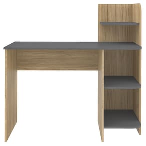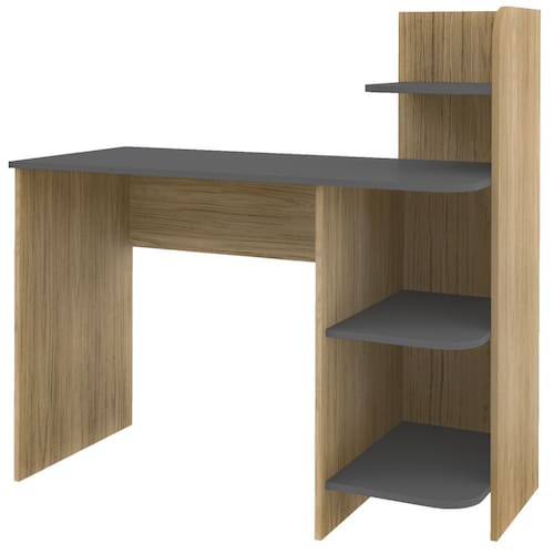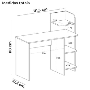 Mesa escrivaninha projetada para otimizar o uso do espaço com eficiência. Estrutura em MDF/ MDP 15mm que suporta até 21kg, amplo tampo, 3 prateleiras laterais com cantos arredondados e sapatas plásticas. Acabamento em pintura UV texturizada (fosca e acetinada) que também contempla o verso do móvel. Este móvel chegará em sua casa separado em 01 volume.