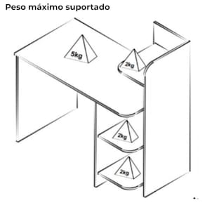 Peso máximo suportado: 21kg (tampo 5kg e prateleiras 2kg cada)