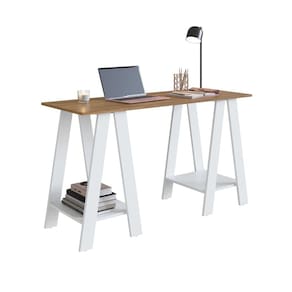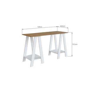 A Mesa Escrivaninha Self tem design moderno e leve, levando elegância ao ambiente. Além disso, os pés são semelhantes a cavaletes com espaço para acomodar seus objetos. O tampo tem amplo espaço para acomodar seu notebook, impressora e outros objetos. Acabamento do Tampo: Finish Foil Acabamento dos Pés: Finish Foil Acompanha Manual de Instalação: Sim Ambiente Principal: Escritório Complexidade da Montagem: Média: pode ser montado por mais de uma pessoa e/ou necessite de maior conhecimento para montagem Cor: Mel / Branco Cor do Produto: Mel / Branco Cor do Tampo: Marrom Cor Flex: Não Cor Interna: Mel / Branco Dobrável: Não Escala de Brilho: Fosco Espessura do Tampo: 15 mm Formato: Retangular Itens Inclusos: 1 escrivaninha e manual de montagem Linha ou Coleção: Escrivaninha Manual de Montagem e Instalação: https://cdn2.madeiramadeira.com.br/atributo/nova-mobile/1774622-7898463865853-5-b61-mesa-cavalete-rev000-livreto-27-02-2023.pdf Material da Estrutura: MDP Material do Tampo: MDP Material dos Pés: MDP Material Principal: MDP Montagem Flex: Não Necessita Montagem: Sim Origem do Produto: Nacional Pés com Regulagem de Altura: Não Pés Reguláveis: Não Peso: 15,52 kg Peso Máximo por Prateleira: 5 kg Possui Painel: Não Possui Painel de TV: Não Possui Passa Cabos: Não Possui Porta Objetos: Não Possui Portas: Não Possui Prateleiras: Sim Possui suporte para CPU: Não Possui Suporte para Teclado: Não Possui Vidro: Não Quantidade de Nichos: Não Quantidade de Prateleiras: 02 Prateleiras Recomendações de Uso, Manutenção e Limpeza: Para a limpeza do móvel utilizar uma flanela seca. Sapatas Niveladoras: Não Sistema de Montagem: Parafusos e cavilhas Suporta Até (kg): 75 kg
