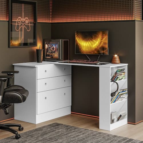 Conta com 3 gavetas e 3 prateleiras bem distribuídas, oferecendo espaço para livros, documentos e itens pessoais. Ideal para manter tudo em ordem com facilidade.