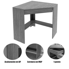Características da Mesa Escrivaninha de Canto para Escritório 1 Gaveta: - Estrutura em MDP; - Acabamento em BP; - 1 Gaveta; - Suporta até 15kg tampo e 3kg a gaveta; - Para uma limpeza mais efetiva, utilizar apenas pano macio umedecido e sabão neutro. Não utilizar produtos abrasivos; - Montagem por conta do comprador; - Não acompanha objetos decorativos;