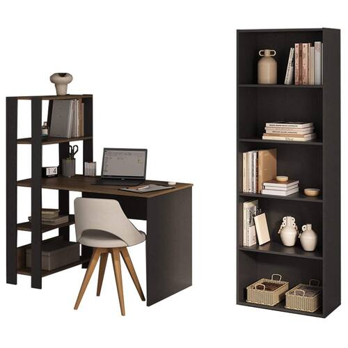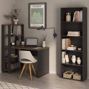 Home Office com Mesa Escrivaninha e Estante: Estilo, organização e praticidade para seu cantinho de trabalho! Conjunto composto por 02 peças, uma estante livreiro e uma mesa escrivaninha com montagem flex. A mesa conta com tampo espaçoso, 3 prateleiras laterais e pode ser montada com a estante para o lado esquerdo ou direito. Já a estante livreiro possui 05 prateleiras fixas com fundo fechado. Ambos os móveis com estrutura em MDP/MDF de 15mm e acabamento em pintura UV texturizada (fosco), garantindo durabilidade e fácil limpeza. Este conjunto chegrá em sua casa separado em 02 volumes.