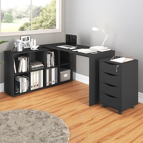 O conjunto de Mesa Escrivaninha em L Eron e Gaveteiro com Rodízios Mity A06 Preto , da Mpozenato, possui um design moderno sendo perfeito para o seu home office.