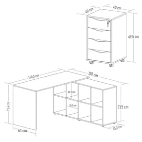 Mesa em L Eron: 140,3/130 x 75,4 x 60 cm.