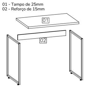 Materiais: Estrutura em MDP (tampo 25mm/ reforço 15mm) e base em Metal.