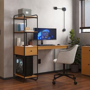 Com prateleiras estratégicas para otimizar o armazenamento e uma gaveta prática para manter seus itens essenciais sempre por perto, esta escrivaninha oferece tudo que você precisa para trabalhar ou estudar com eficiência e conforto.