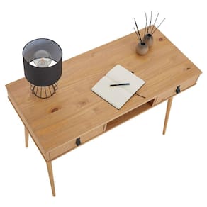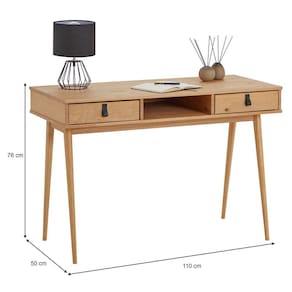 A Escrivaninha Kim é um móvel elegante e versátil, perfeita para o seu espaço de trabalho em casa. Sua superfície espaçosa oferece espaço suficiente para realizar tarefas e organizar materiais, pode também ser usada com notebook. Os pés cilíndricos conferem um estilo rustico/minimalista e elegante. Além disso, possui duas gavetas com puxadores em couro e com amplo espaço para manter seus itens organizados, e um nicho integrado para armazenar objetos de forma prática e adicionar personalidade ao móvel.