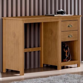 Mesa Escrivaninha projetada para quem busca um móvel sofisticado e atemporal. Com 110cm de largura e produzida em madeira maciça de pinus de reflorestamento, sua estrutura robusta garante durabilidade e resistência. Seu acabamento com pintura acetinada em verniz PU e UV realça a beleza natural da madeira enquanto protege contra desgastes do dia a dia. O design funcional inclui 02 gavetas com corrediças telescópicas, permitindo uma abertura suave e silenciosa, além de 01 nicho aberto, ideal para acomodar livros, revistas ou objetos decorativos. Os puxadores metálicos no estilo concha agregam um charme artesanal, e os pés alongados em madeira trazem leveza e sofisticação ao móvel. Este móvel chegará em sua casa separado em 01 volume.
