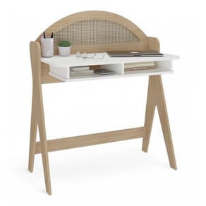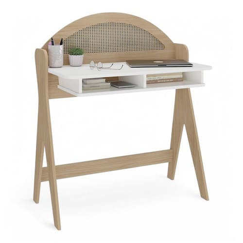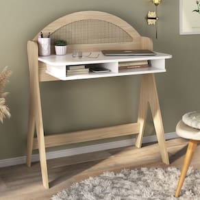 O grande destaque dessa peça é o painel arredondado com pintura 3D e acabamento em palha, que confere uma estética única e agradável. Além de sua beleza, a Escrivaninha Cecília oferece praticidade: dois nichos estrategicamente posicionados garantem espaço adicional para organizar livros, materiais e acessórios, mantendo tudo ao alcance das mãos.