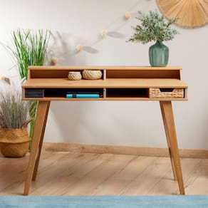 A estante de madeira maciça, localizada na parte superior da escrivaninha, oferece ainda mais espaço de armazenamento. Você pode exibir livros, fotos, plantas e outros elementos decorativos que agregam personalidade ao ambiente. A Escrivaninha Luna proporciona um espaço de trabalho funcional e sofisticado, onde você pode realizar suas tarefas com conforto e organização.