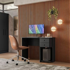 Com duas gavetas equipadas com corrediças metálicas e excelente profundidade, você terá espaço de armazenamento prático e organizado para manter seus materiais essenciais sempre à mão. A presença de um suporte dedicado para CPU otimiza o espaço e contribui para um ambiente mais organizado.