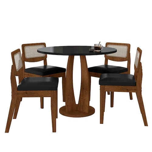 Detalhes Técnicos da Mesa -Acabamento:Pintura UV Texturizada -Material da Base:MDF -Material do Tampo:MDF -Medida da Mesa Montada:A:80CMxL:90CMxP:90CM -Tonalidade da Mesa:Freijó/Preto -NÃO POSSUÍ VIDRO
