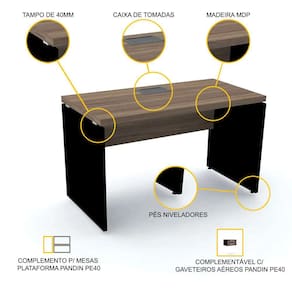 Elaborar a planta de um escritório unindo funcionalidade, beleza e bom gosto pode ser difícil. Porém, com móveis práticos e de boa qualidade, o desafio se transforma em uma tarefa fácil. Ao desenhar o projeto das mesas de seu ambiente corporativo, considere esta mesa modulável frontal da linha PE40 da Pandin, que é o móvel certo para ficar na ponta da sua plataforma de trabalho, já que foi confeccionado levando em consideração as medidas de duas mesas plataforma iniciais, juntamente ao painel divisor que as une (peças da mesma linha, vendidas separadamente). Com tampo em cor de madeira escura e pés pretos, ela ainda conta com caixa Power Box para facilitar a instalação de aparelhos eletrônicos ou telefônicos, podendo servir como mesa base para impressora, telefone ou central de cabos. Esta mesa é uma peça com a qualidade da linha PE40 da marca Pandin, conhecida por seus móveis de escritório de design clássico e sofisticado que unem beleza, funcionalidade e estilo ao melhor custo-benefício do mercado.