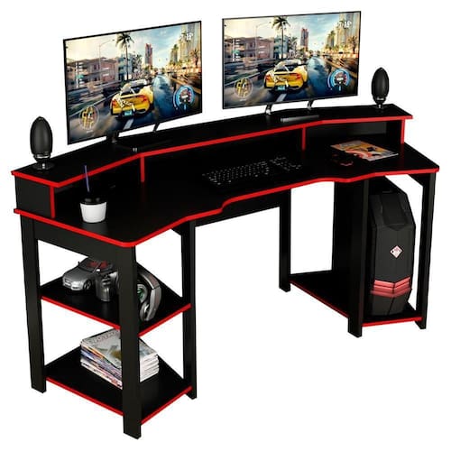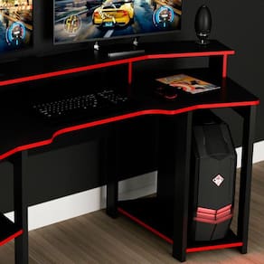 Produto: 01 Mesa Gamer | Tonalidade: Multicolorido | Cômodo Indicado: Escritórios Cor: Preto Vermelho