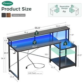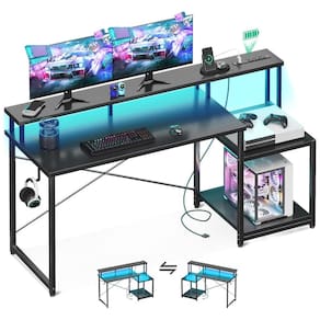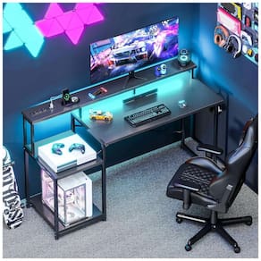 A estrutura de metal espesso de alta qualidade garante estabilidade e durabilidade. A mesa também conta com uma prateleira completa para monitor, proporcionando amplo espaço de armazenamento e um ângulo de visão confortável. A prateleira é reversível e ajustável, podendo ser instalada à esquerda ou à direita conforme sua preferência, e pode ser ajustada em duas alturas diferentes. Além disso, você pode usar a prateleira superior para uma impressora grande ou um scanner, e o gancho para fones de ouvido instalado no lado oposto da mesa mantém seus acessórios organizados e acessíveis.
