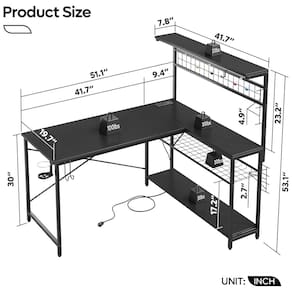 Equipada com 2 tomadas elétricas e 2 portas de carregamento USB integradas, a mesa permite carregar seus dispositivos com facilidade. O design reversível da mesa inclui uma prateleira aberta de 2 níveis à esquerda, equipada com uma grade de ferro ajustável para armazenar o suporte de CPU, notebooks, material de escritório e outros itens essenciais. À direita, há um gancho de ferro e um porta-copos dobrável, ideais para fones de ouvido e bebidas.