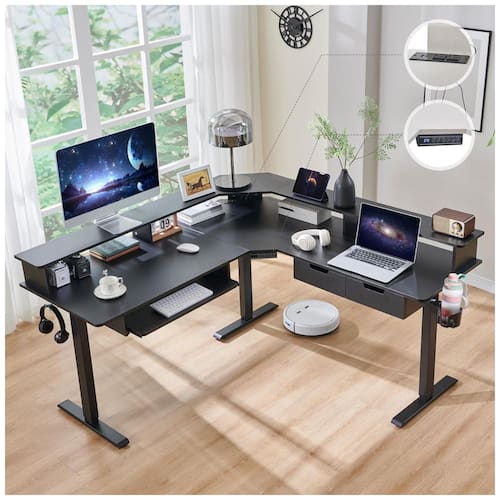 A Mesa em L Elétrica RedLemon de 60 polegadas (152 cm) em acabamento fibra de carbono preta possui mecanismo de elevação elétrica com ajuste de altura de 71 cm a 117 cm e 4 memórias pré-programadas para seleção rápida via controle touch. Estrutura metálica com tampo de madeira engenheirada de 2,5 cm de espessura integra prateleira para monitor, duas gavetas tipo caixa com corrediças suaves, bandeja retrátil para teclado, ganchos laterais, suporte giratório 360° para copo e tomadas elétricas com portas USB para carregamento simultâneo de múltiplos dispositivos.